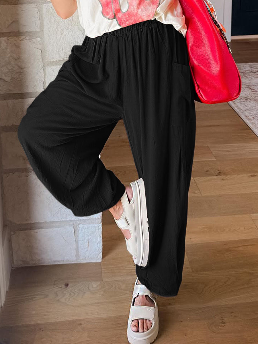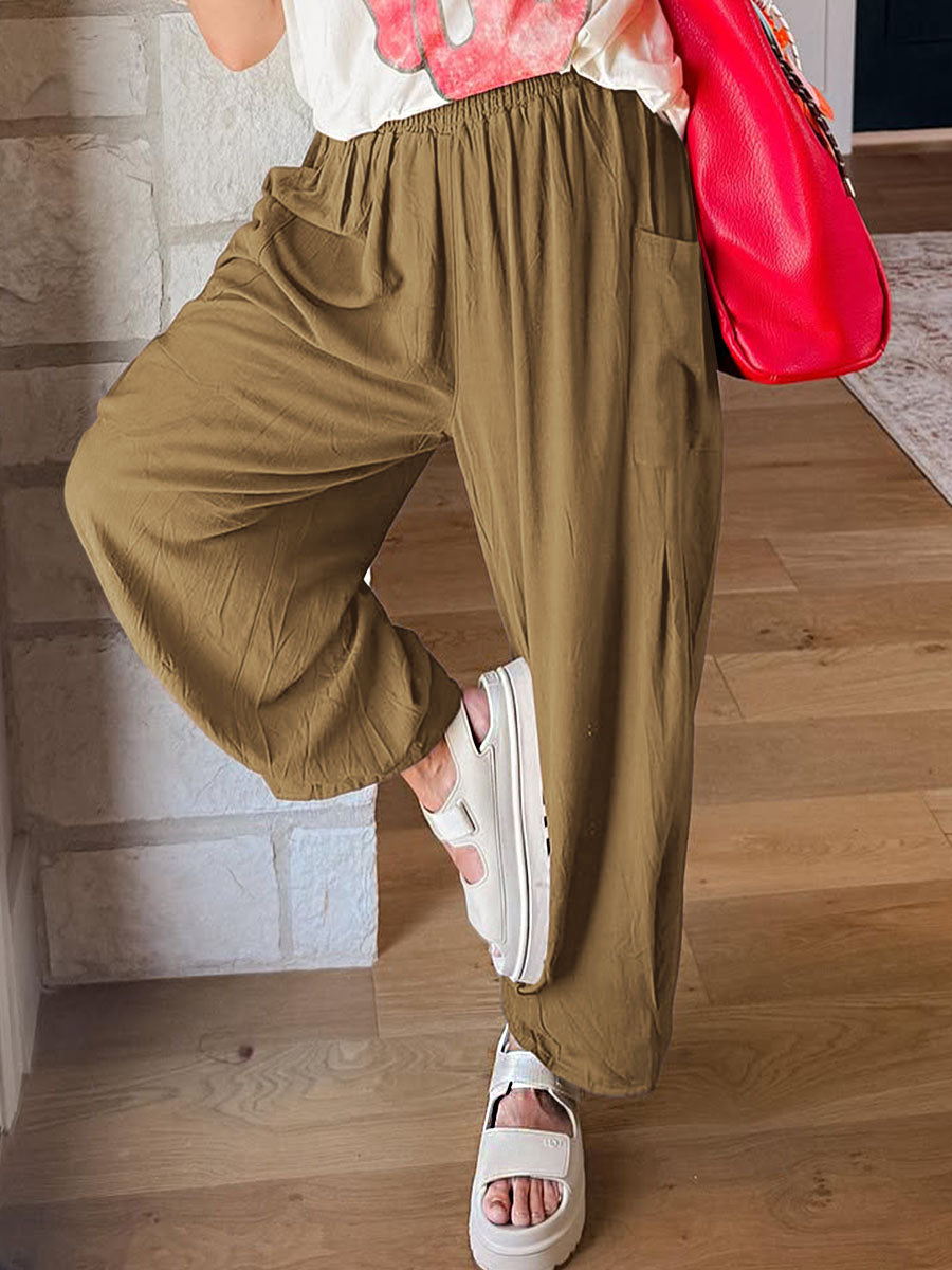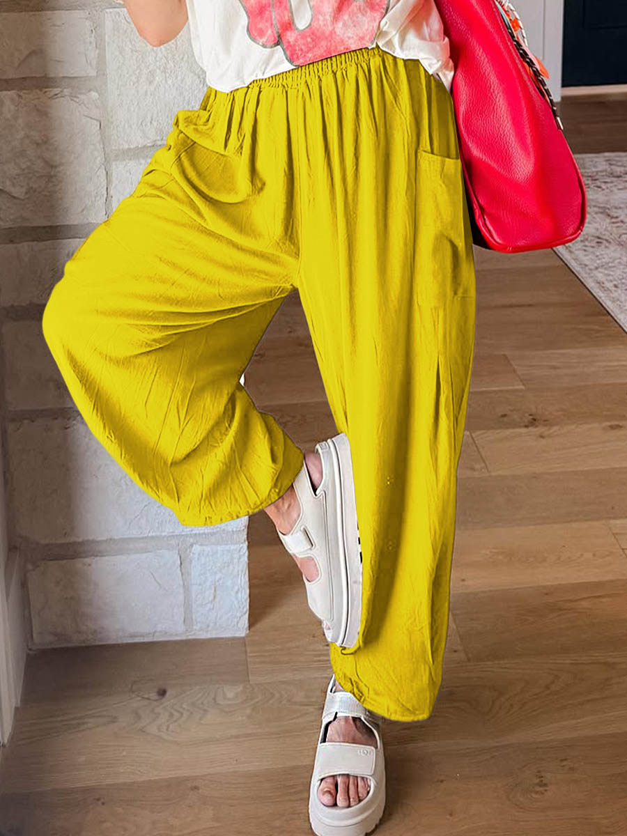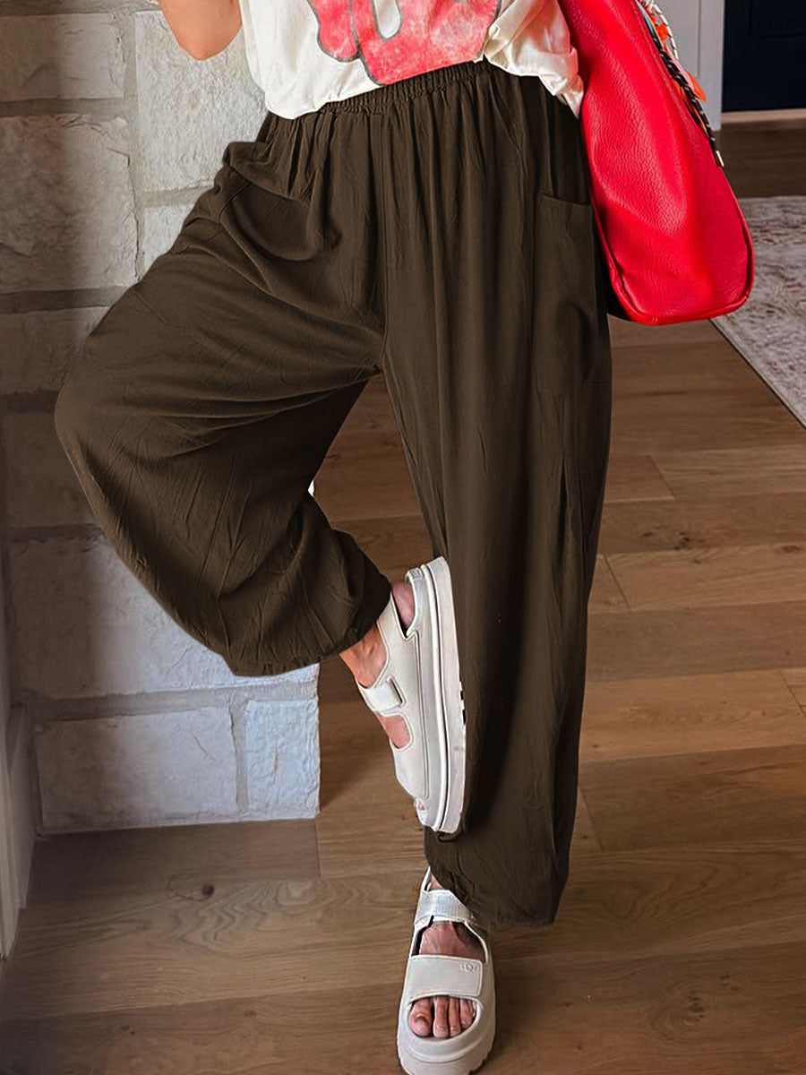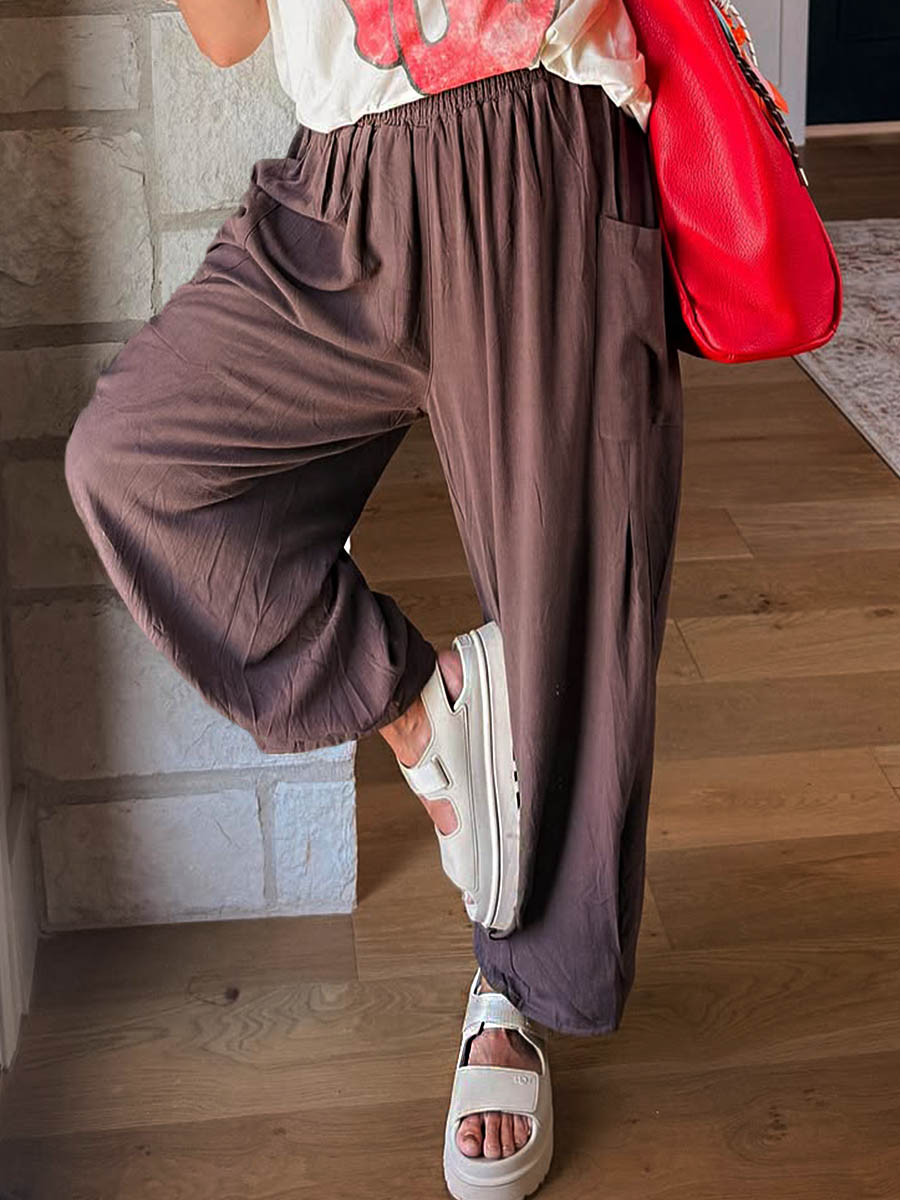 Adicione um toque de conforto descomplicado e estilo casual ao seu guarda-roupa com esta calça de modelagem ampla. Confeccionada em tecido leve e fluido, ela oferece caimento solto e liberdade total de movimento — perfeita para o dia a dia e momentos de relaxamento. O cós elástico garante um ajuste prático e confortável, enquanto os bolsos laterais adicionam funcionalidade ao design.