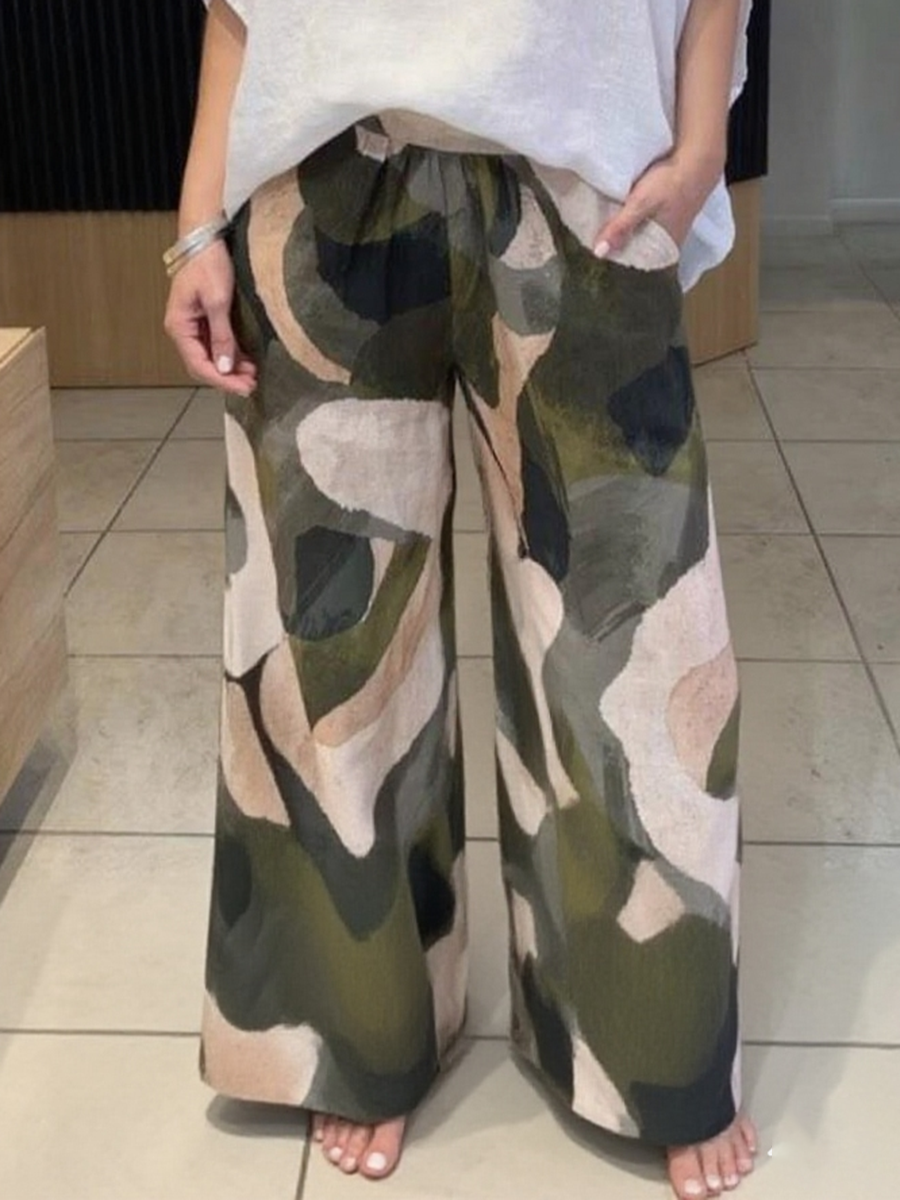 Adicione um toque de elegância artística e conforto moderno ao seu guarda-roupa com esta calça pantalona estampada. Com um design fluido e estampa abstrata em tons terrosos, ela combina estilo contemporâneo e leveza natural. O tecido leve e respirável oferece conforto durante todo o dia, enquanto o cós elástico proporciona um ajuste prático e agradável.